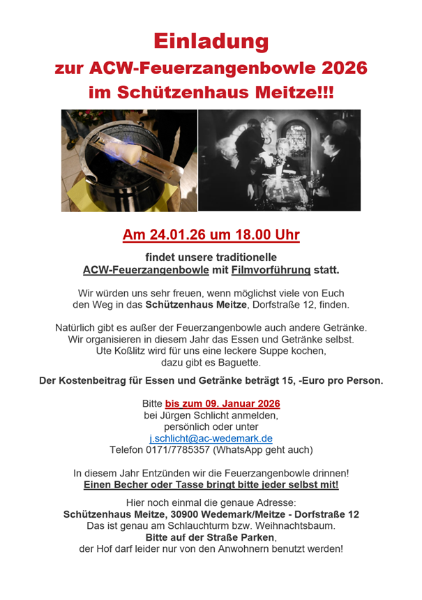 In dem sehr gemütlichen Schützenhaus in Meitze fand in diesem Jahr die traditionelle ACW-Feuerzangenbowle statt. Wir bedanken uns besonders bei Ute und Doris, die an alles gedacht haben und uns mit Speis und Trank versorgt haben.